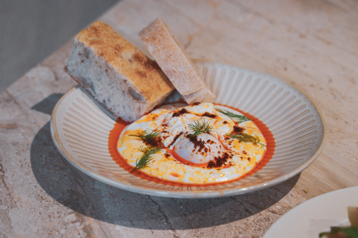 土耳其蛋是一款水波蛋搭配希臘優格與香辣油的組合,就日搭配了歐式麵包,鬆軟帶點嚼勁,在劃破水波蛋的療癒過程中,辣油的香氣不斷撲鼻而來,是蠻特別的餐點,但我一直想到乾麵的味道,怎麼會這樣XD。