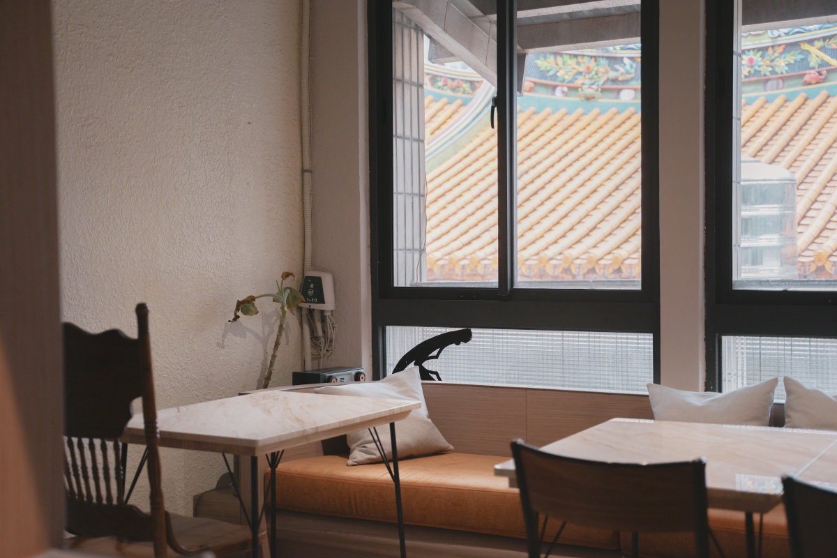 附近有熱鬧的街巷,小吃、商店林立,走在騎樓下不時有人進出,感受到匆忙的日常裡,每個人都在為生活努力,而在走進就日咖啡館後的步調便慢了下來,窗外能看見超過百年的護國城隍廟,令人不由自主的平靜下來,好好享受身處的空間、桌上的食物、眼前的人。