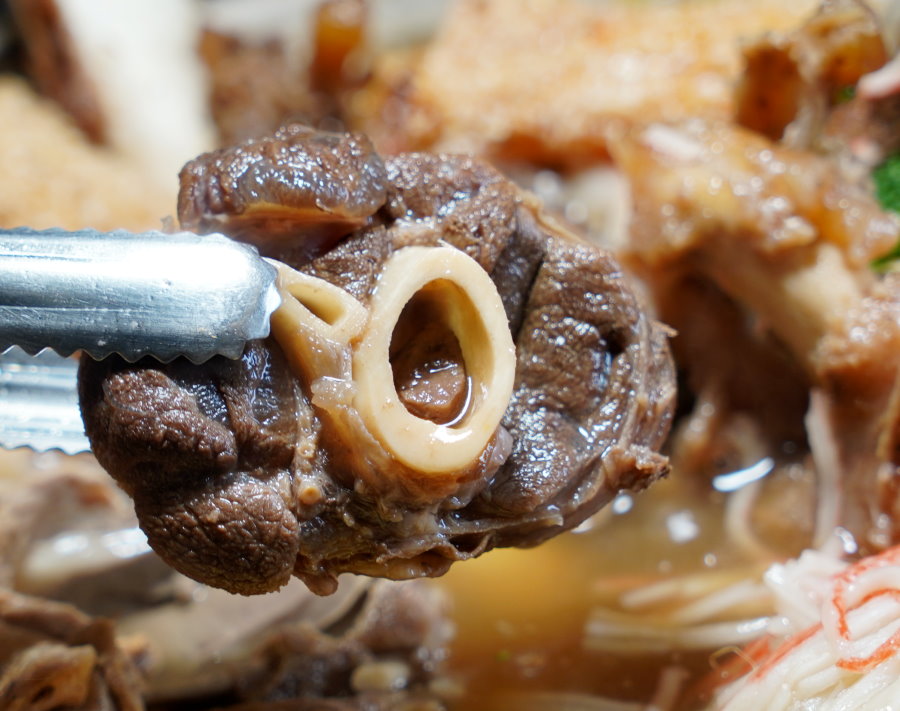 ▼羊大骨也是我們吃羊肉爐的重點之一,可以先將湯頭加進去骨洞中稍微攪拌一下,用吸管就能吸到香濃的骨髓;一旁的骨邊肉也不是蓋的,軟嫩鮮滑的滋味好迷人,啃食起來超過癮啊!