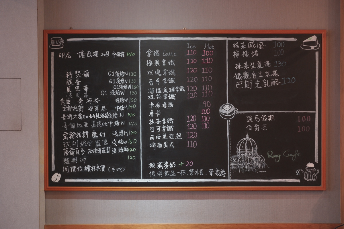 離開甜衷秧回到家,隔天佐治傳訊息問我帽子是不是忘在餐廳?我說沒有啊!是兒子的吧⋯⋯於是我們下週又再往中部跑,再吃了一次飪室咖哩,就來去沙鹿榮咖啡!榮咖啡的招牌並不顯眼,也不是時下流行的漂亮白色簡約系風格,但是一走進那溫馨親切的感覺,迎接客人的老闆帶著笑容指引我們座位,詢問我們要點些什麼?餐點都在黑板上,沒有制式的菜單和嚴謹的規矩,就很自在的口頭點單,離開才結帳。
