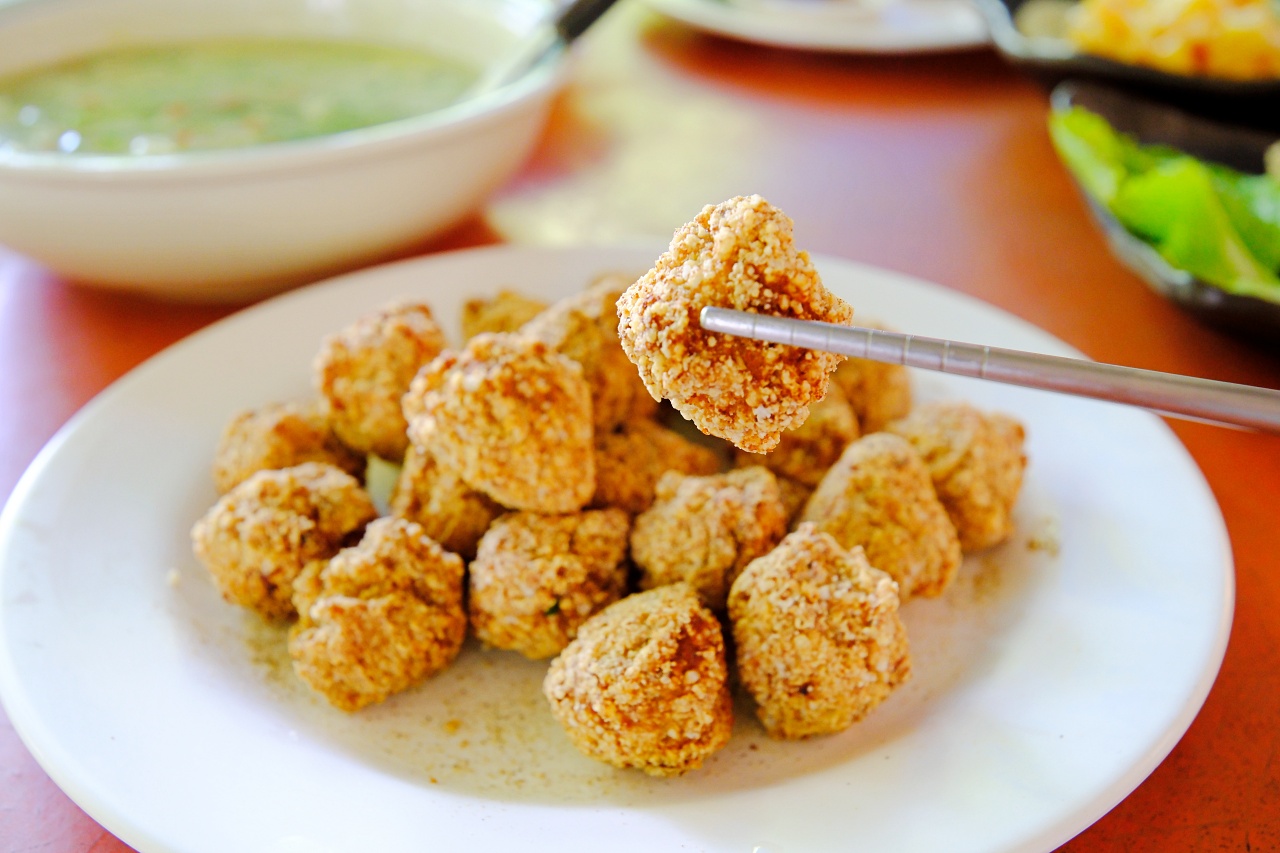 ▲「炸劍旗魚卵」:這是山豬溝餐館的拿手料理,炸成雞米花球的外觀,其實是魚卵耶!吃起來外面酥脆,裡面嗶嗶波波的魚卵顆粒,越咀嚼越香,超級推薦!外帶回民宿當下酒菜也超棒的。