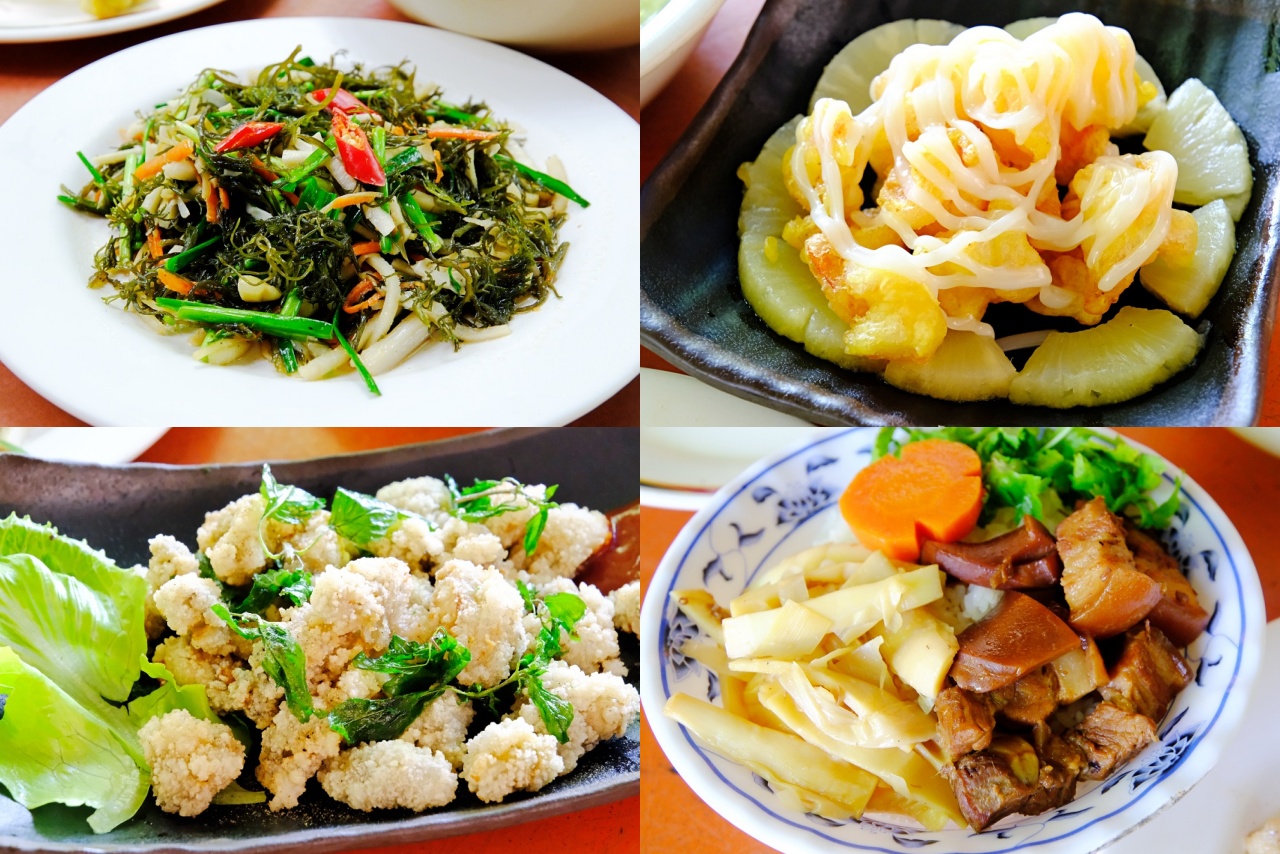 ▲左到右、上到下:炒海菜、鳳梨蝦球、炸蚵酥、魷魚滷肉飯