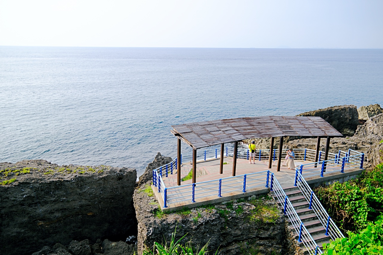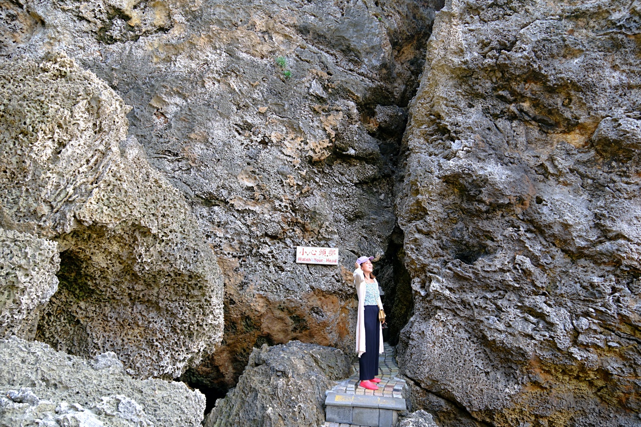 ▲在烏鬼洞的入口處先來張到此一遊照。最靠近海邊的珊瑚礁岩石上設有怡橋、碧濤亭等觀景平台,讓人盡情享受無敵海景!落日時刻這裡是很美的賞落日景點喔,還能近距離欣賞台灣海峽的海景。