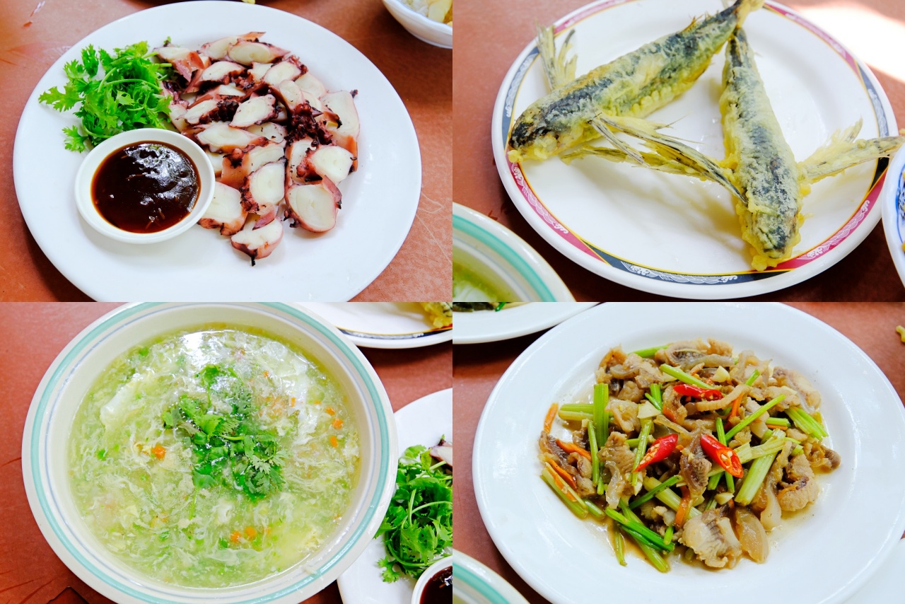 新鮮切片的「薑醋章魚」沾上微酸的薑醋醬,特別提鮮。「炸飛魚」是一人一條這樣吃,實在太霸氣!餐廳常常見到的「吻仔魚羹」這裡也有耶,「炒三娘尾」就是炒鯊魚尾,口感比鯊魚肉多了Q脆度,很特別。