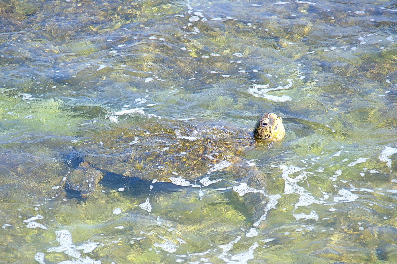 ▲幸運的話站在岸邊也可以遇到海龜喔!完全不怕人,自由自在地覓食著。