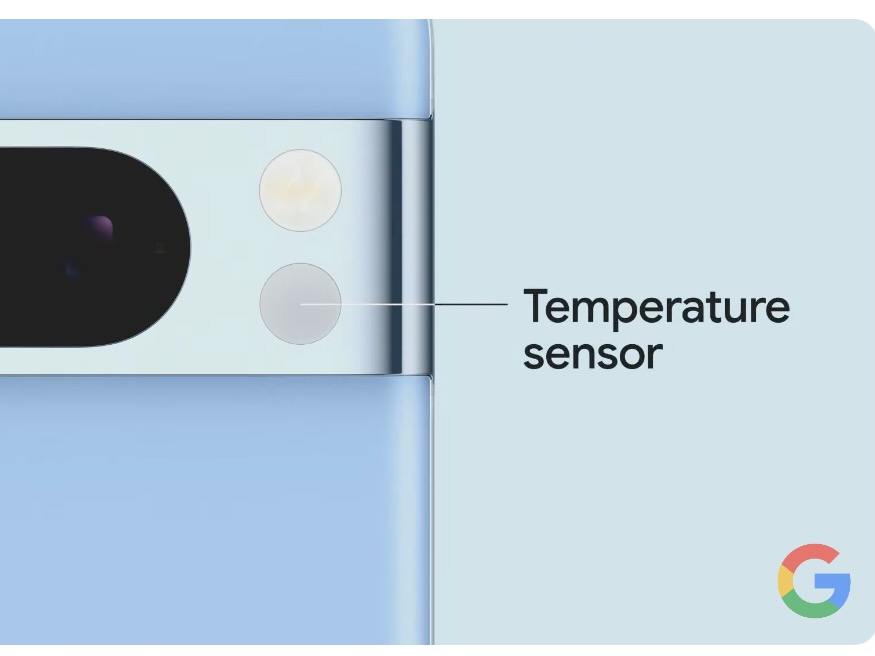Pixel 8 Pro 還新增了溫度感應器,能夠透過掃描物體方式,幫助使用者快速取得物體的溫度資訊,像是查看鍋具溫度是否適合烹飪;或確認嬰兒奶瓶的溫度是否在合適的溫度。Google 也希望未來能夠擴大溫度感應的應用場景,並已經向美國食藥署送出申請,讓使用者能夠透過溫度應用程式,量測體溫並儲存相關數據於 Fitbit 應用程式中。