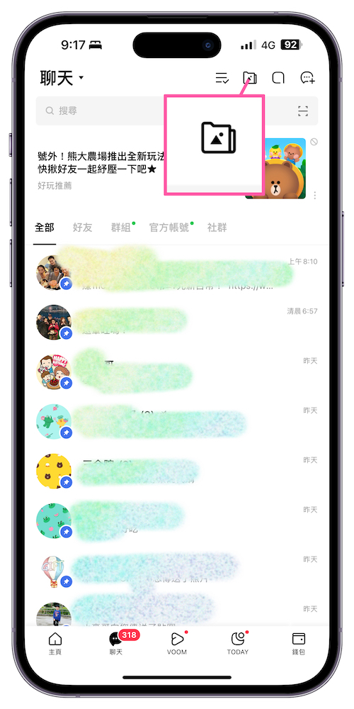 步驟 1、只要將手上的 LINE 更新到 13.16.0 版,打開聊天室首頁後會看右上方的有著「相簿」的圖示。