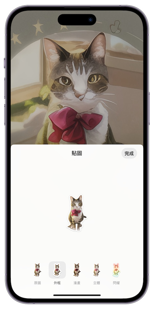 我們選擇想要變成貼圖的圖案後,就能像一般製作貼圖一樣,在出現閃光後,選擇「加入貼圖」,甚至更進一步來「加入效果」讓貼圖變成自己更想要的感覺。