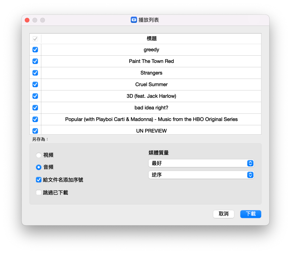不只可以單一部一部影片下載,也可以下載整個播放清單,如果想要大量下載劇集離線播放的話,就可以使用這樣的下載方法,而且最高可以下載 4K 畫質,或是想要把 YouTube 轉成 MP3、想要下載高音質音樂也都沒問題。