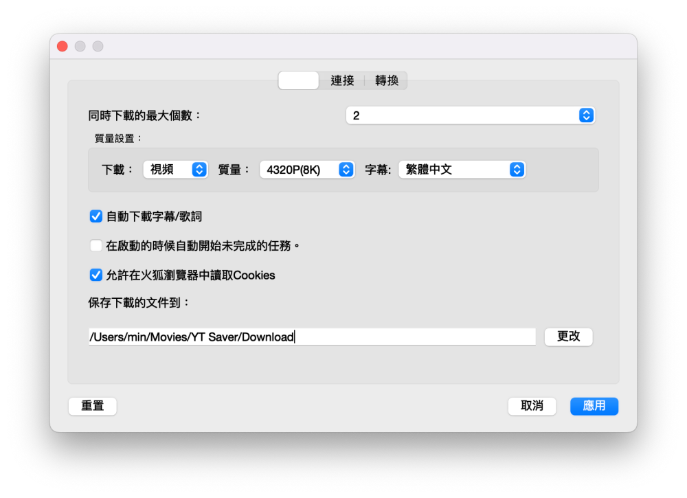 如果是 Mac 系統使用者且有付費使用 YT Saver 的話,點選最上方工具列裡的偏好設定,可以進行進階設定,包含設定同時下載的數量(可選擇 1~10)、設定下載品質(最高可下載 8K 影像),是否要同時下載字幕等。