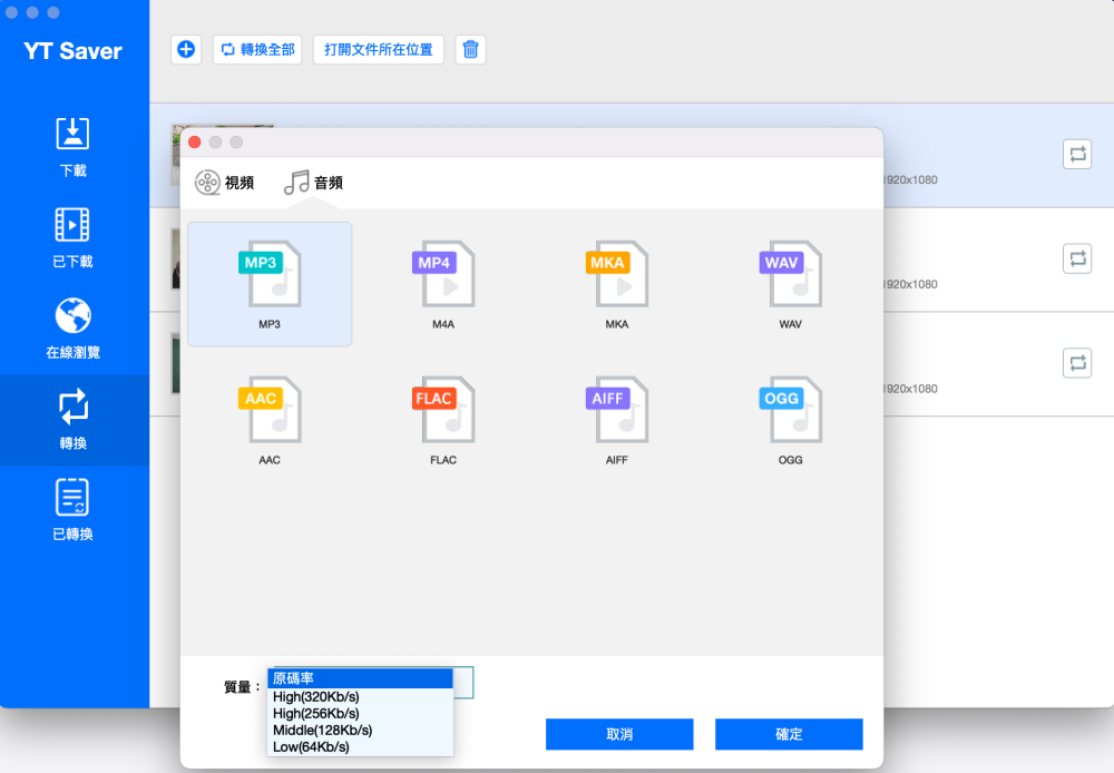 若是下載音訊的話,可以選擇 MP3、M4A、MKA、WAV、AAC、FLAC、AIFF、OGG 等格式,下載品質可以選擇從 64kb/s 至 320kb/s,端看使用者需求。