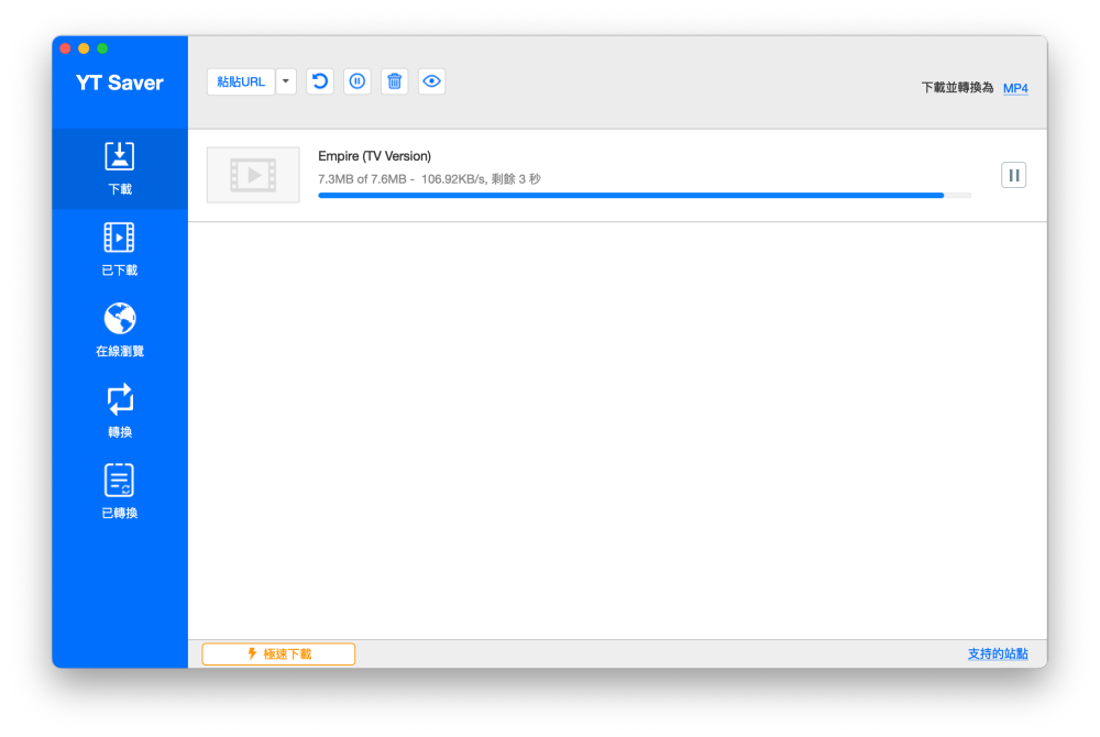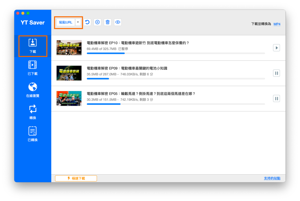 第二步驟:在「下載」工具列欄目中,點一下 YT Saver 軟體左上角的「黏貼 URL」,畫面就會出現剛剛複製的 YouTube 網頁影片,並顯示進度條開始下載。