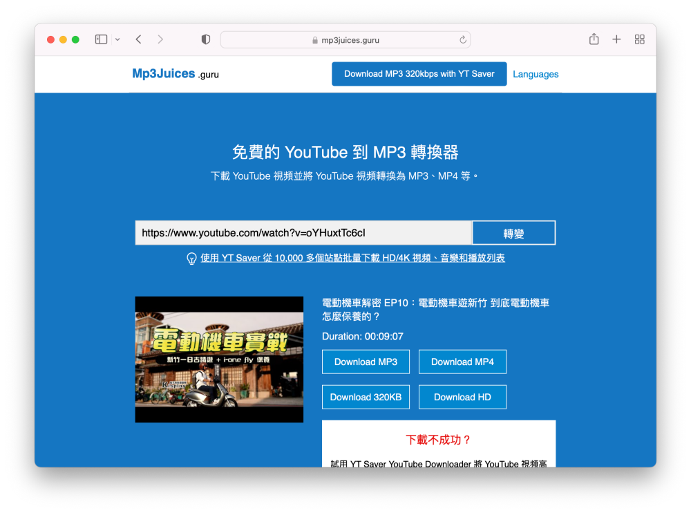 接下來就可以選擇要下載 MP3、MP4、320KB 畫質或是 HD 畫質的內容了。
