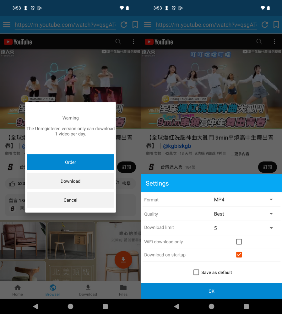 按下後會提醒使用者,如果是免費版的話一天只能下載一次,但有付費註冊者不在此限,此外也可以選擇下載格式、下載品質、一次下載的數量、是否只能在 Wi-Fi 環境下下載等等。