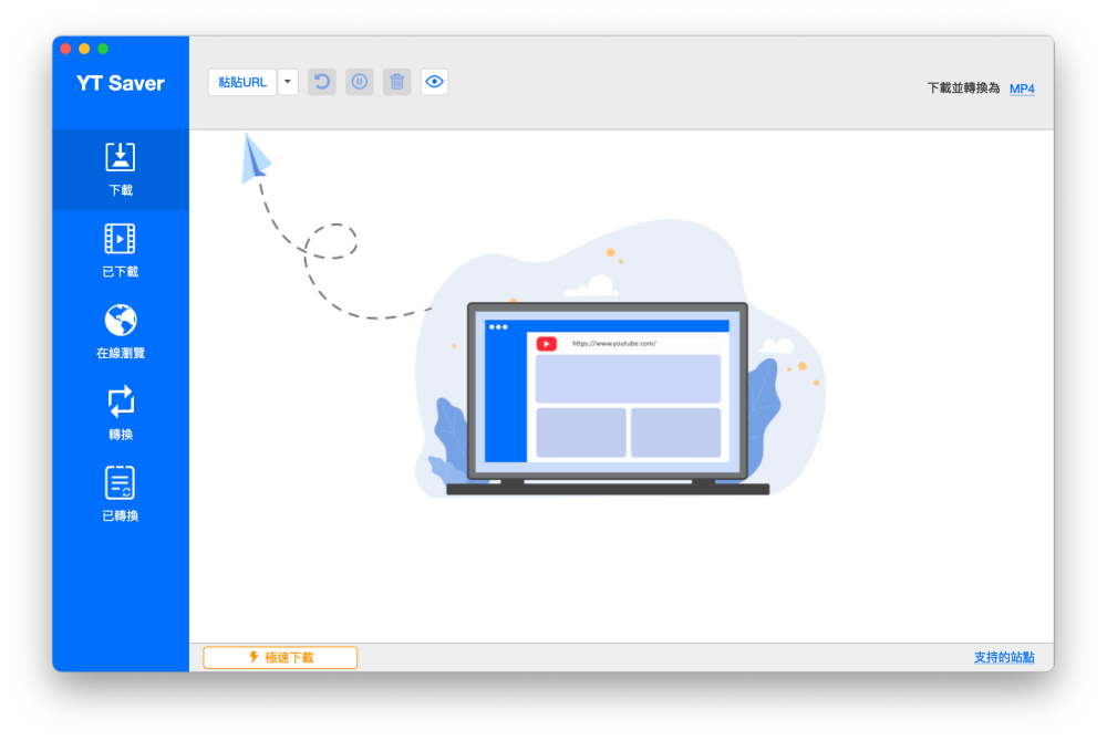 先來看一下 YT Saver 的使用介面,YT Saver 整體介面設計的很簡單,左側工具列,可以查看下載中和已下載的影片或音訊,也可以查看轉換中和已轉換的檔案。