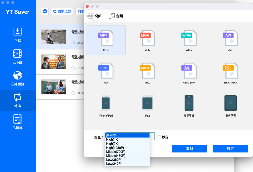 影片下載的格式也有非常多種格式可以選,影片格式可以選擇 MP4、MOV、WMV、AVI、FLV、MKV、HEVC MP4、HEVC MKV、iPhone/iPod 裝置格式、iPad 裝置格式、Android 手機和平板格式等,下載時就可以設定好下載品質,從最低 240P 到 4K 都可以。