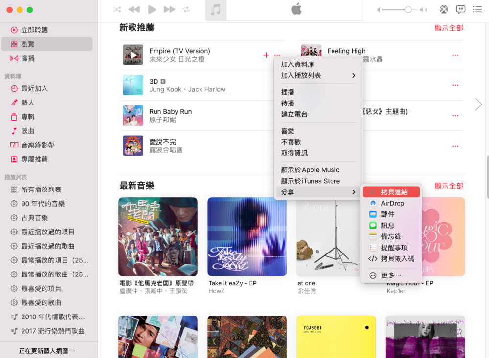 在想下載的音樂上按右鍵點選「分享」、「拷貝連結」,複製音樂來源網址。