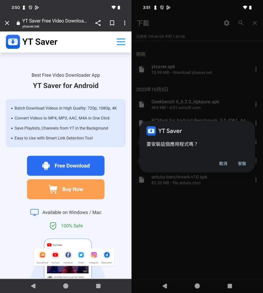不只提供 Windows 和 macOS 電腦版,如果是 Android 手機的話也可以到 YT Saver 下載 apk 檔案,完成安裝後,手機就可以和電腦一下,下載任何影音網站、社群平台的影片了。