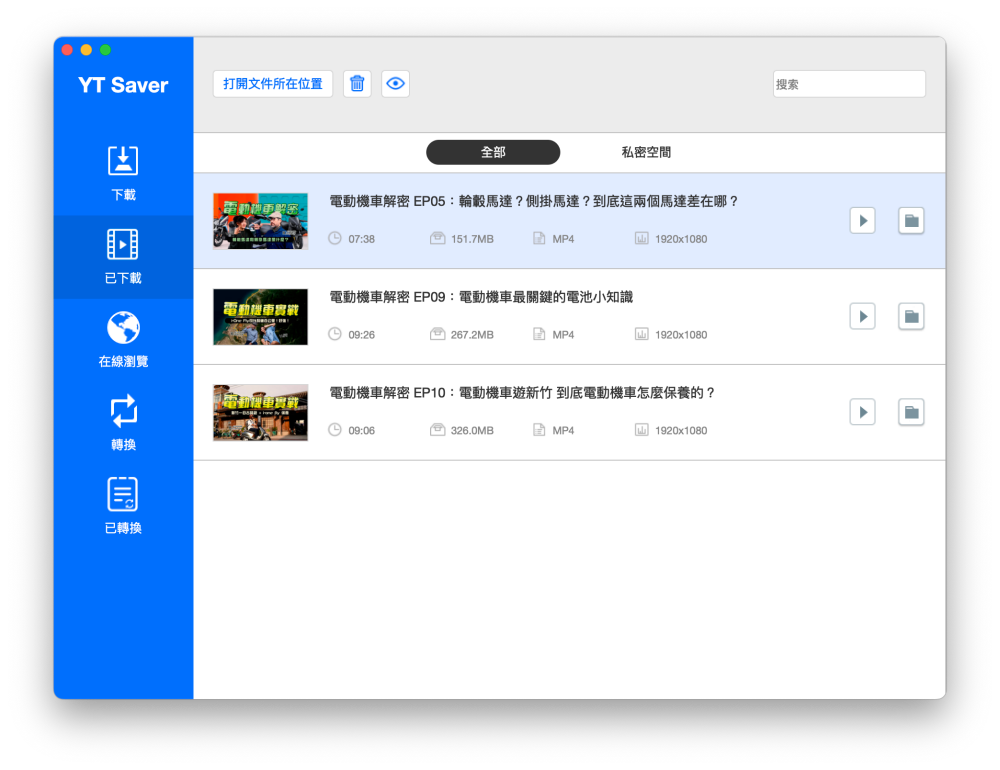 第三步驟:下載完成的影片可以在「已下載」欄目中查看,可以直接使用 YT Saver 播放,也可以點選播放鈕右側的資料夾選項,打開儲存的資料夾另外使用其他播放軟體播放。