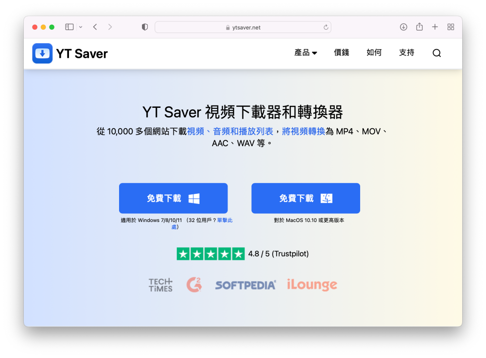 YT Saver 影片音樂下載軟體目前提供 Windows 版以及 MacOS 版,只要是 Windows 7 版本以後的用戶、MacOS 10.10 以後的用戶都可以在 YT Saver 官網免費下載電腦端軟體使用。