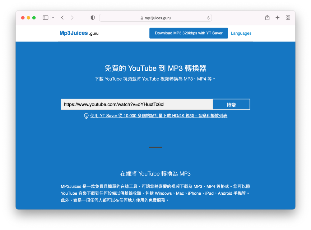 YouTube 轉 MP3 下載:https://mp3juices.guru/en1/