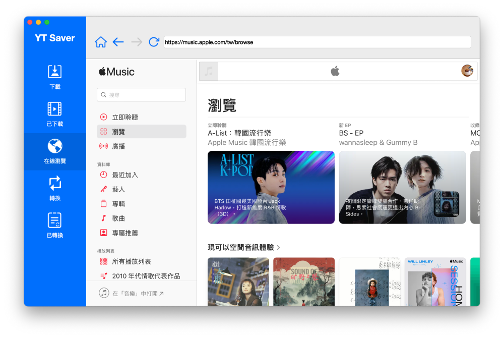 從 YT Saver 左側的在線瀏覽,可以點選 Apple Music 網頁來下載音樂。