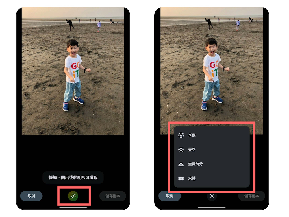 步驟 4、除了調整人像,剛剛在進入「魔術修圖」時下方也有著一個與「魔術修圖」一樣彩色但是是筆刷的圖示。這裡面會依照我們照片的場景提供可以修圖的主題,如果有人物,那麼就會有「肖像」、有天空,就會有「天空」類別、有海邊的話,甚至還有「水體」的類別。