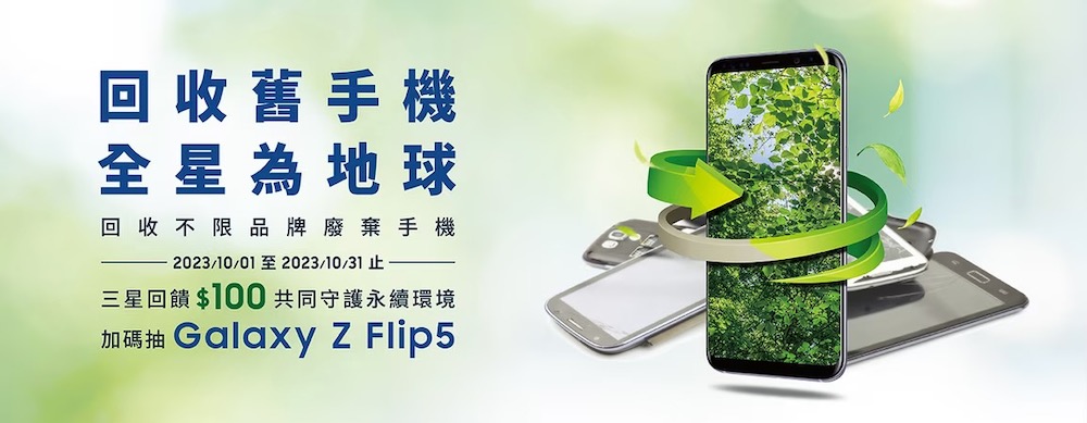台灣三星響應 2023 手機回收循環月(10 月 1 日至 10 月 31 日),辦理期間限定抽獎活動!消費者凡於 10 月 1 日 (日) 至 10 月 31 日 (二) 活動時間內,至指定活動地點回收不限品牌之廢棄手機,完成回收手機登錄流程,填寫一組 6 碼的確認碼,即可獲得三星主辦的抽獎機會(單一 LINE 帳號最多獲得 1 個抽獎機會)。台灣三星將於 2023 年 11 月 13 日 (一),針對符合上述活動資格之消費者,加碼抽出旗艦機 Galaxy Z Flip5 (256G) 2 台。