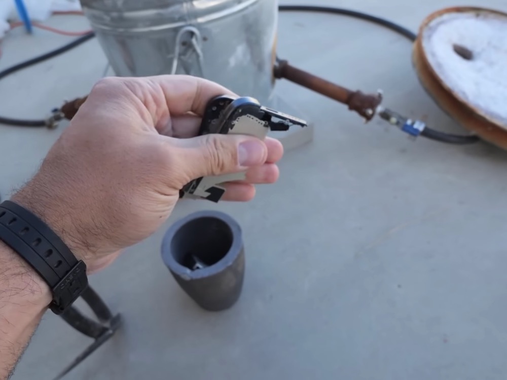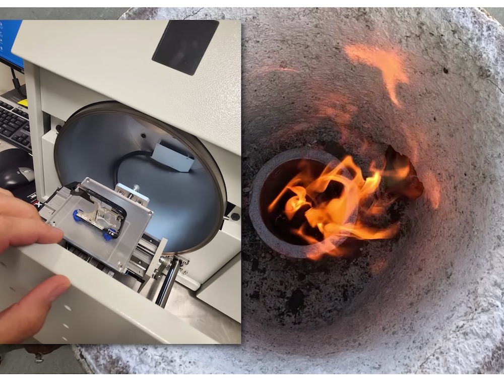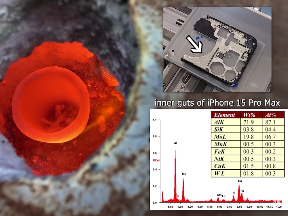 在影片中 Jerry 表示我們已經知道 iPhone 15 Pro 的外殼是使用名為 Solid State Diffusion 的技術,來將鈦金屬來包裹著鋁合金所組成。這次借到了小熔爐將能夠提供 2000 度華氏(F),約 1093 度攝氏(C)的高溫。而鈦金屬的熔點在 1640 度C、鋁金屬在 815 度C,這也表示當實驗結束後,熔爐中將僅會剩下鈦金屬材質的零件,而鋁金屬零件會熔化。