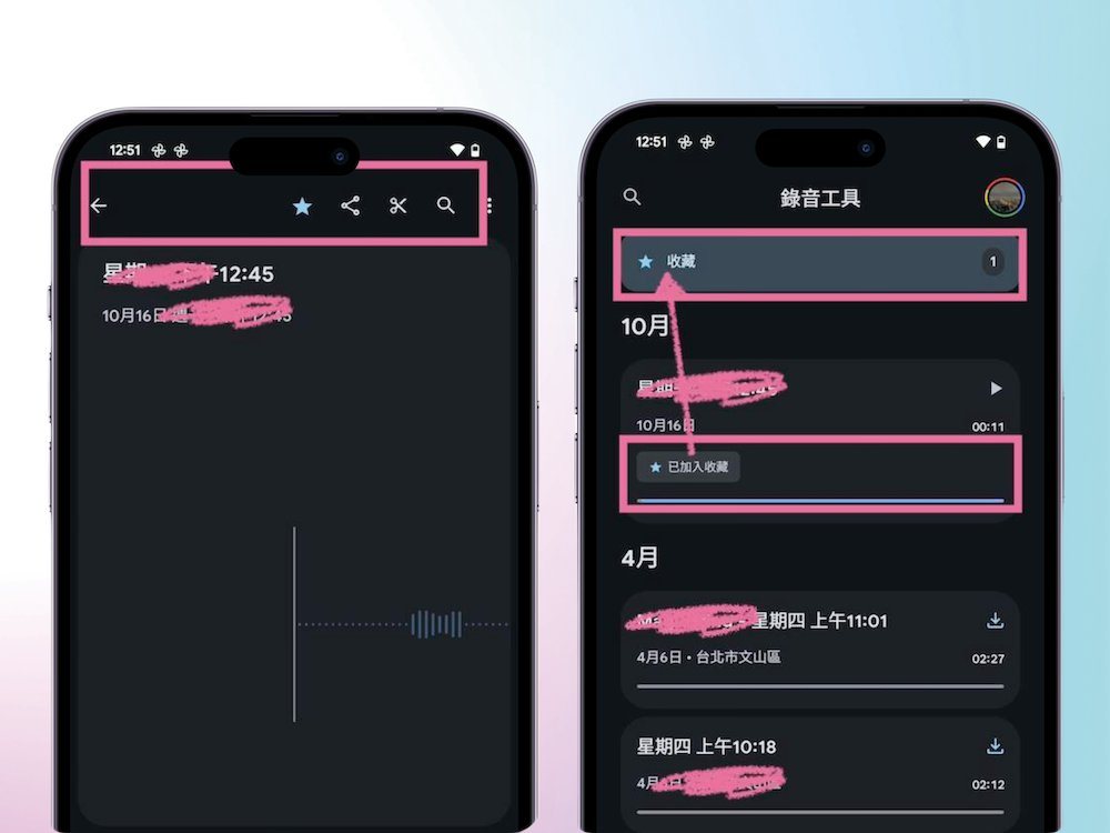 現在只要在 Google Play 中更新「錄音機工具」,就能在錄音檔案中看到一個星形符號,點選後就會收藏至頂端的「收藏」資料夾。