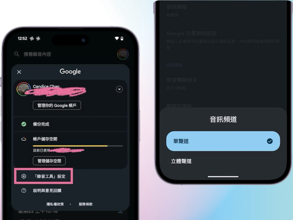 另一個新功能則是在錄音工具右上方頭像中選擇設定,會看到「錄音工具設定」裡新增「音訊頻道」選項,裡面提供了「單聲道」與「立體聲道」2 種選擇,讓我們在錄音的時候能夠視情況決定,是僅需要收錄前方主講人的聲音單聲道或是有左右環境聲音需要收錄而使用立體聲道。