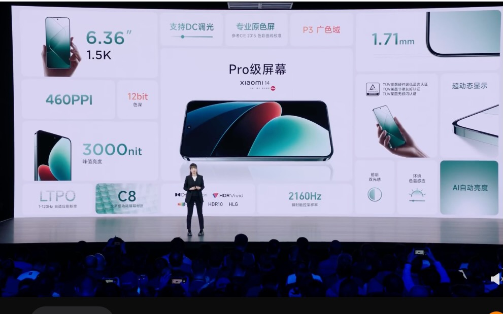 規格方面,Xiaomi 14 採用 1.5K 解析度 6.36 吋 C8 OLED 12-bit 螢幕,460PPI、支援 1-120Hz LTPO 自適應更新率、3,000nits 峰值亮度、Dolby Vision 和 HDR10+ 支援。