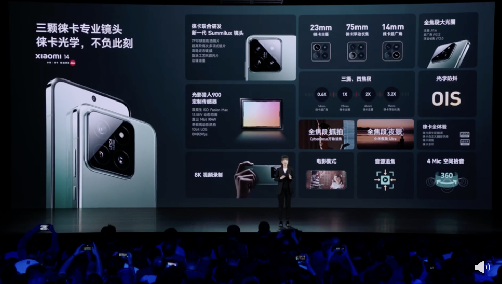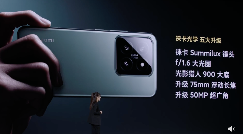 Xiaomi 14 配備 Leica 合作研發的新一代 Summilux 光學鏡頭,光圈可達 f/1.6,主打低光源能拍攝出更多細緻的內容,小米發表全新的影像感測器品牌「光影獵人」,Xiaomi 14 使用的是光影獵人 900,搭配徠卡 Summilux 鏡頭,感光量較小米 13 提升 180%。