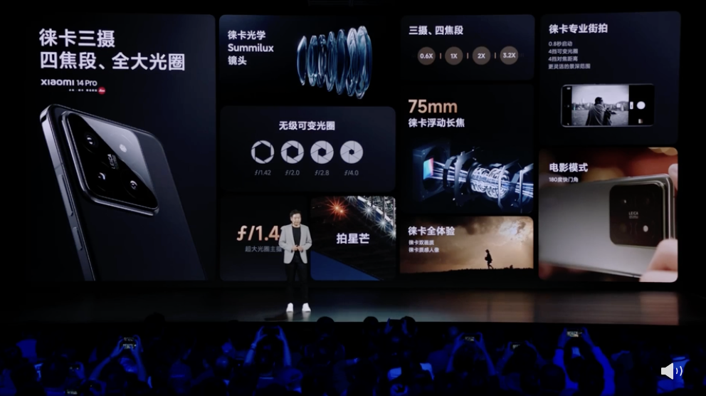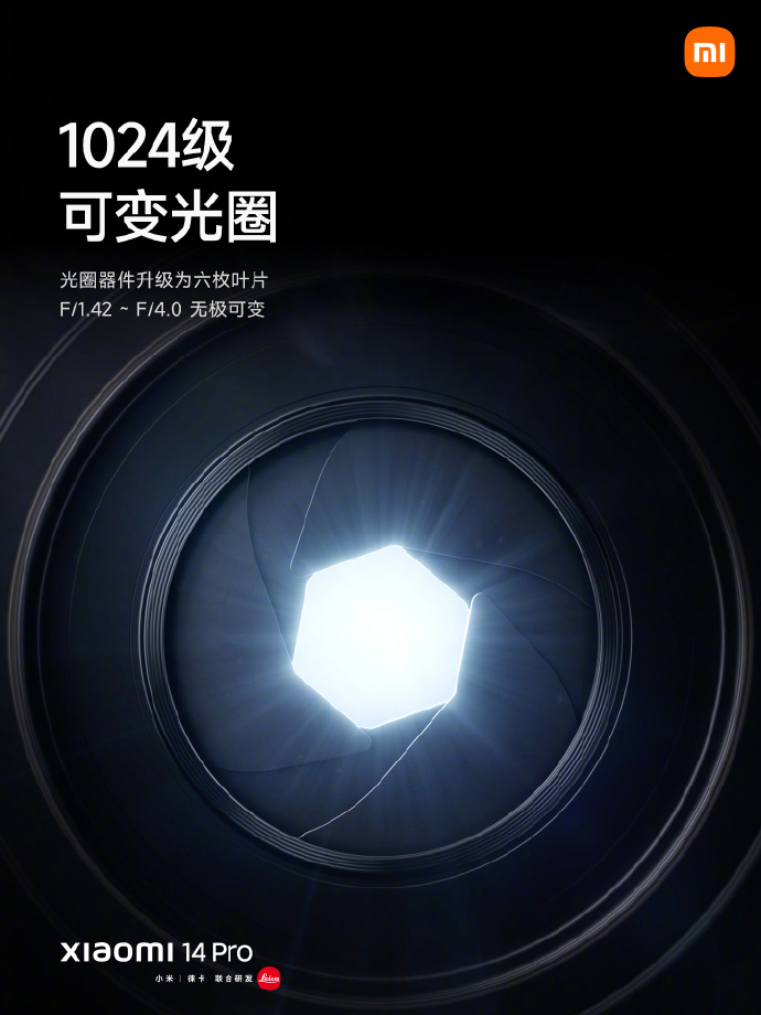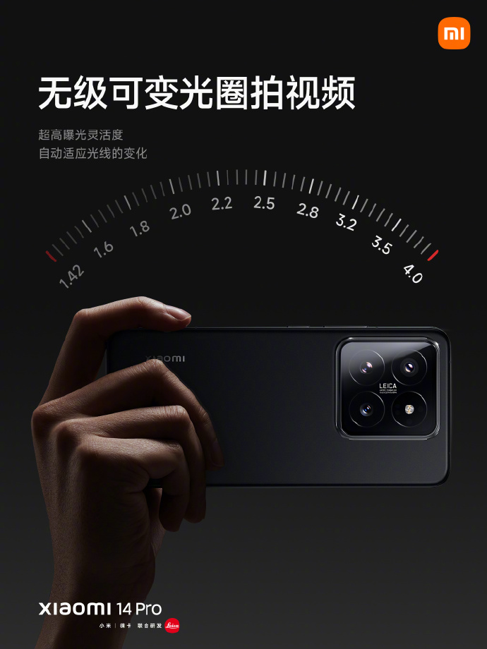 小米也表示 Xiaomi 14 Pro 支援「無級光圈」功能,提供 1024 級可變光圈,在拍美食、合照、文件的時候,能夠自己依照情況來從 f/1.42 到 f/4.0 調整。錄影的時候更是會依照環境光線、主角來自行調整光圈,讓創作者拍攝出更多滿意的作品。