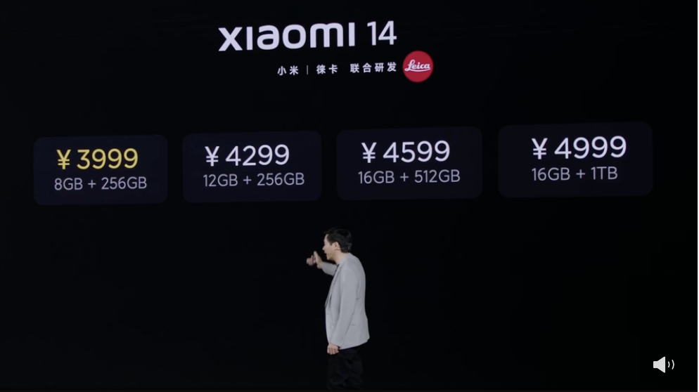 Xiaomi 14 提供了 8GB + 256GB 3,999 人民幣(約 NT$17,770)、12GB + 256GB 4,299 人民幣(約 NT$19,000)、16GB + 512GB 4,599 人民幣(約 NT$20,400)、16GB + 1TB 4,999 人民幣(約 NT$22,200)。