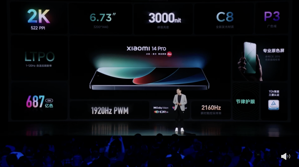 Xiaomi 14 Pro 螢幕 6.73 吋 2K 522 PPI 螢幕, C8 OLED 螢幕,460PPI、3,000nits 峰值亮度。