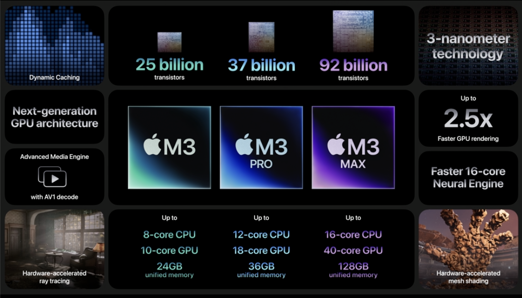 M3 處理器系列包括了 M3、M3 Pro 和 M3 Max。這些新晶片採用 3nm 工藝,如 A17 Pro。GPU 使用一種稱為動態快取的新技術。M3 系列也是首款適用於 Mac 的 3 奈米晶片,GPU 提升 2.5X、神經網路引擎則比 M1 系列晶片快 60%、比 M2 快 16%,CPU 效能核心和節能核心分別比 M1 中的核心快了 30% 和 50%;而且,全新媒體引擎現在支援 AV1 解碼。