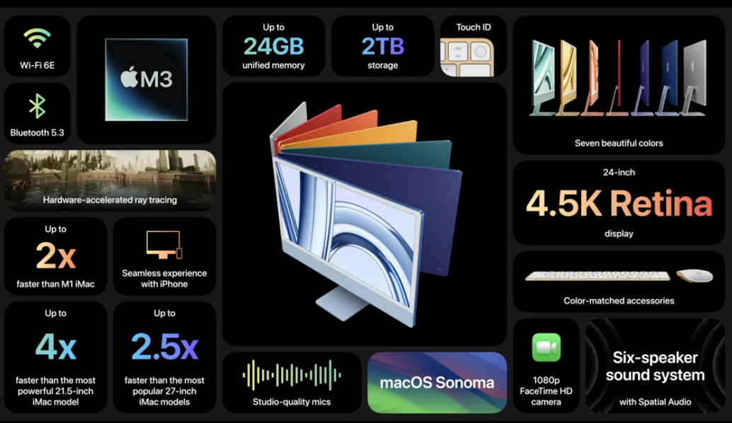新款 iMac 在外觀上與前代非常相似,顯示器也和以前一樣是 24 吋、4.5K解析度。最大的特色是改用了 M3 晶片,這也是 iMac 自 2021 年配備 M1 晶片後的再次更新。