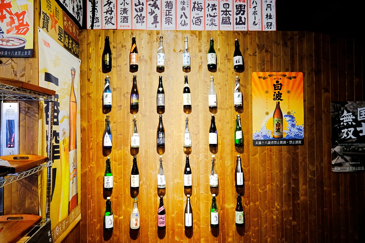▲這一面酒瓶網美牆實在壯觀,【隱居 居酒屋】除了專注於料理,在酒類的選擇也非常多樣,有燒酎、吟釀、清酒、梅酒…等等。