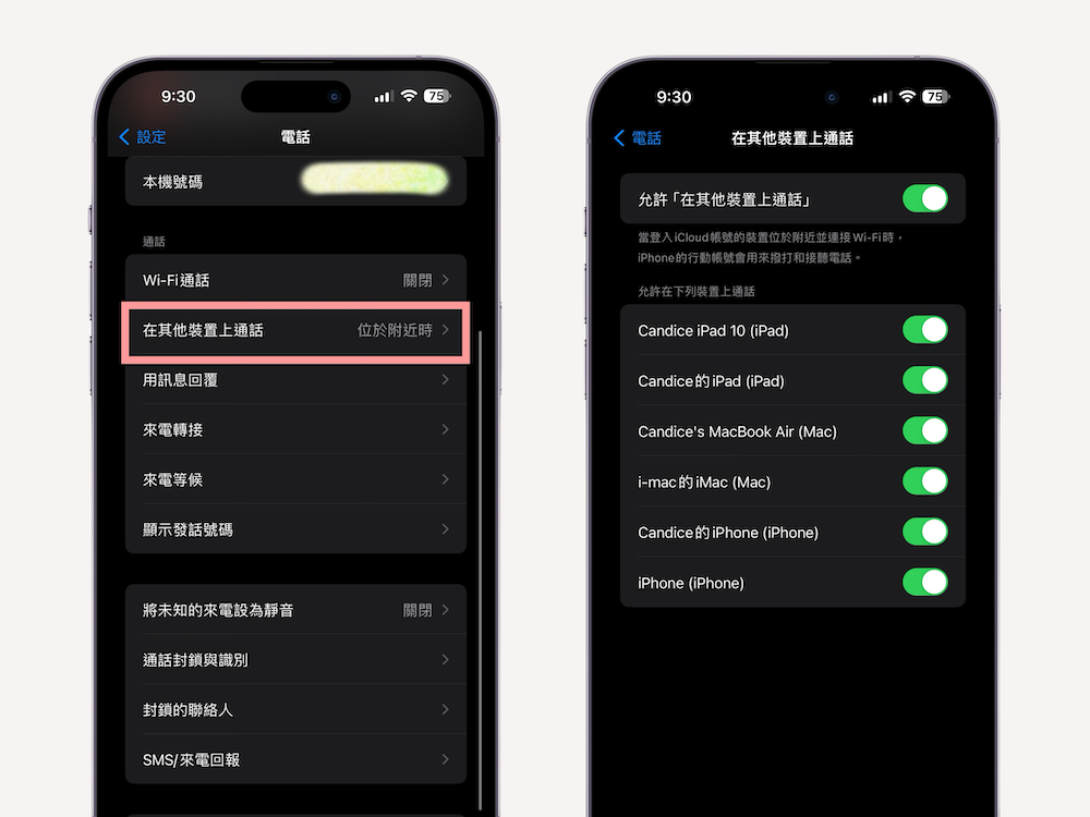 步驟 1、依照路徑:「設定」>>>「電話」後,往下滑選擇「通話」分類中的「在其他裝置上通話」