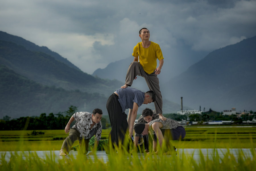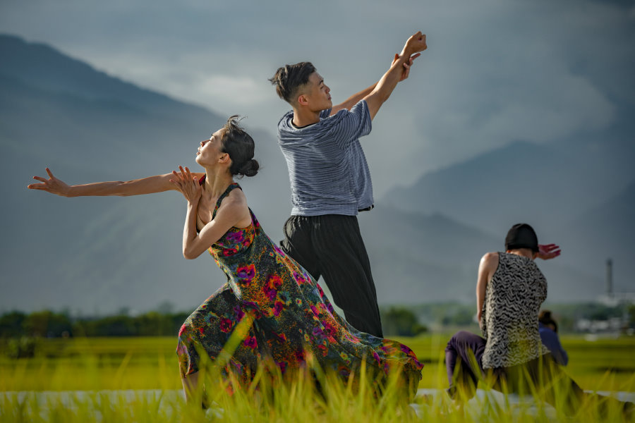 ▼「天光.霞」是在疫情期間,舞者被隔離在家,藝術總監鄭宗龍用視訊方式讓舞者即興演出,再將他們的動作轉化為動人的「霞」,最後再將舞台從劇場移到池上稻田間,重新調整演繹出獨一無二的「天光.霞」;舞者專業的動作與姿勢非常有張力,搭配遠山、稻田更有感覺了~~彷彿從清晨劃開黑暗的天光,有種等待黑夜褪去,即將迎來光亮的感覺!