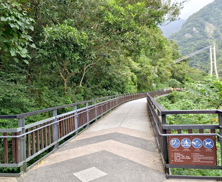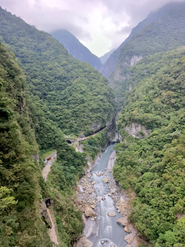 ▼布洛灣吊橋橋長196公尺,橋面寬2.5公尺,距離溪谷約152公尺,是太魯閣國家公園跨距最長、距離溪谷落差最大的吊橋,從橋側拍起去也好壯觀啊!