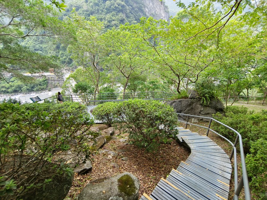 ▼環流丘公園位於布洛灣下臺地邊緣,木棧道環繞整個環流丘一圈,全長約有300公尺,算是非常平緩好走,並設有觀景平台、涼亭可供休憩,不僅可以欣賞到動植物生態,也可以俯瞰立霧溪谷、水壩的美景。
