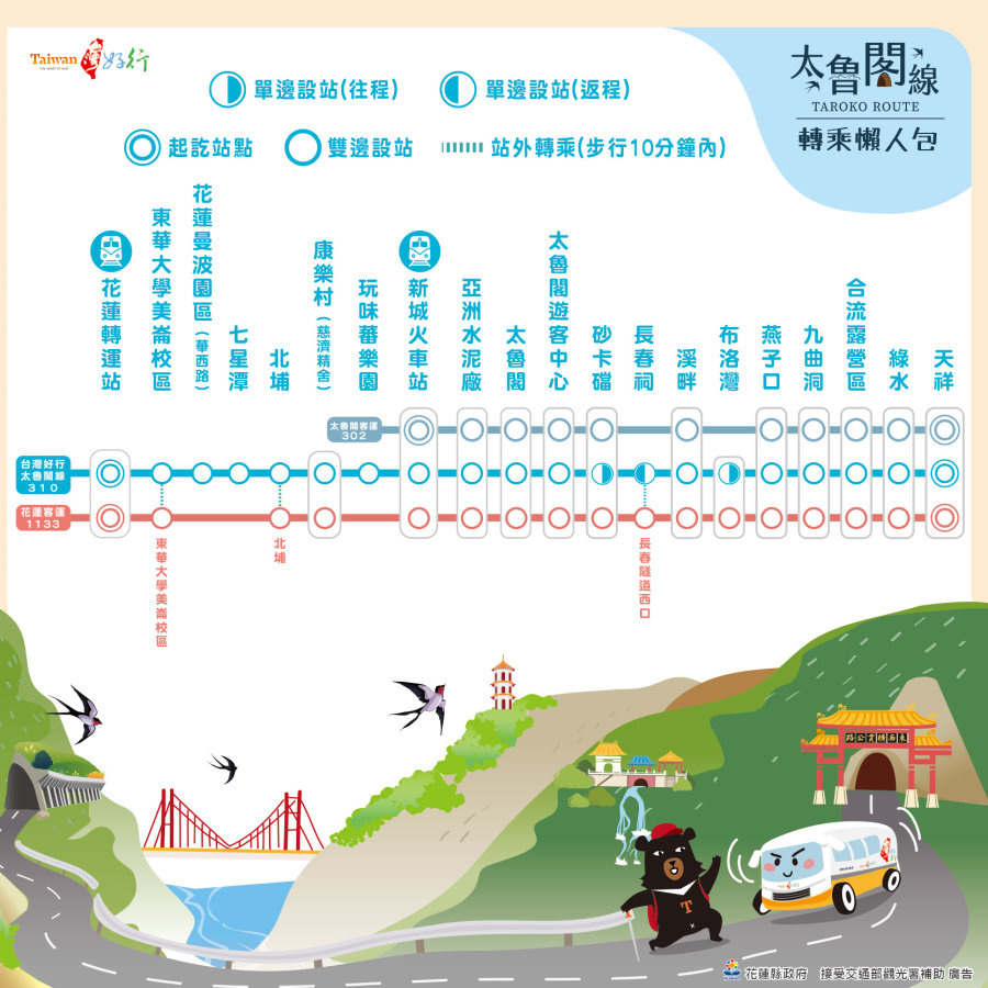 ▼「台灣好行310太魯閣線」路線圖,其中有幾站是單邊設站,大家要特別留意一下!我們這次的遊程是太魯閣遊客中心、砂卡礑、布洛灣、天祥,回程再去長春祠、新城火車站,一整天玩下來剛剛好!