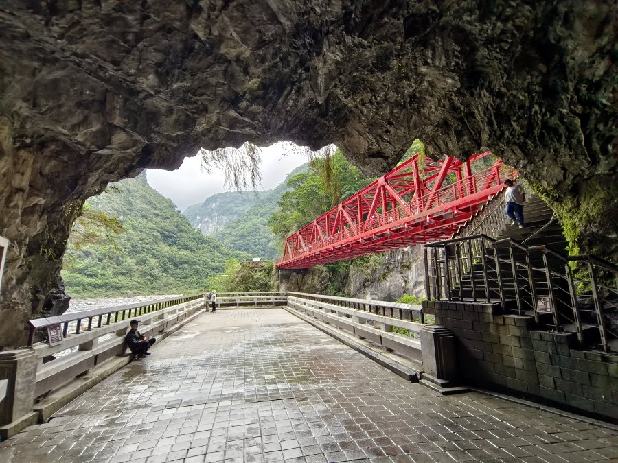 ▼從石壁洞穴往斷橋方向看也有不錯的景致,搭配大紅色系的長春橋更是亮眼!
