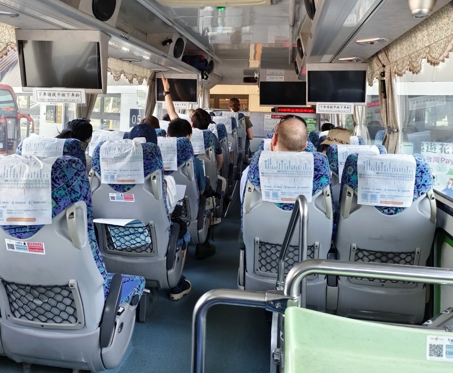 ▼車上除了本國人之外也有不少外國朋友,大家都想去太魯閣走一圈,不用開車、找車位,還可以節能減碳,以太魯閣線全程來說,每人每趟可以減少生產半包B4影印紙(250張),可見搭乘台灣好行是最方便又環保的交通方式!