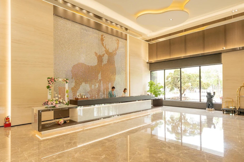 新悅花園酒店從2018年開幕到現在其實也算是蠻新穎的,挑高明亮大廳,櫃台後面的梅花鹿馬賽克拼貼好漂亮,還擺放了幾隻可愛的台灣黑熊,天花板更是以阿里山神木森林為意象所設計的造型,整體相當舒服。