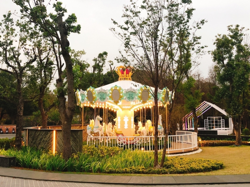 豐富的親子設施是新悅花園酒店一大賣點,開車從大門口進來就可以看到一座夢幻旋轉木馬,房客可以免費無限搭乘,小小孩會很開心,大人拍照效果也是相當棒呢!