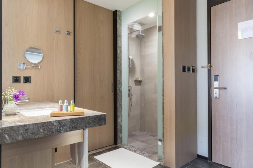 衛浴乾濕分離,廁所和淋浴間也各自獨立,個人衛生備品都準備在檯面和抽屜裡,稍微可惜的是沒有免治馬桶。