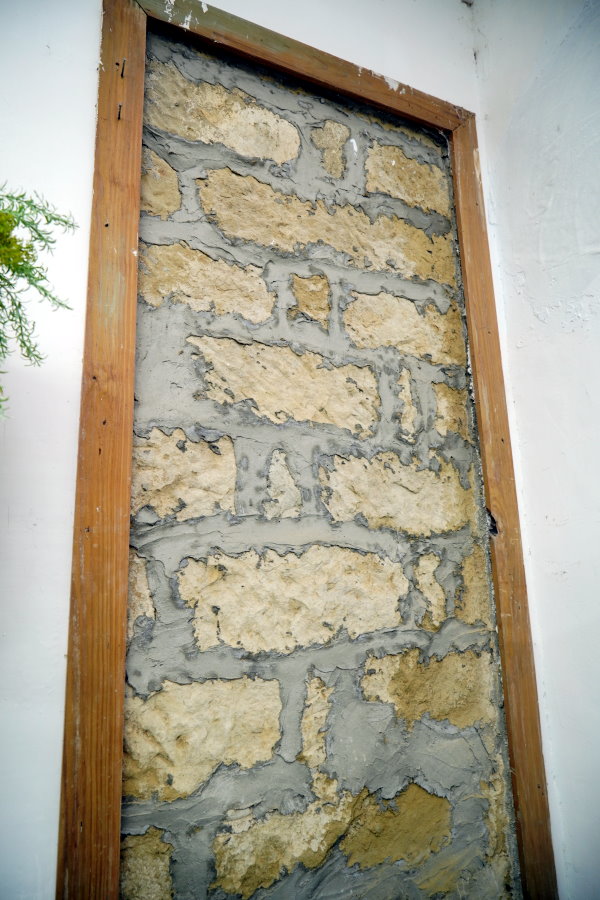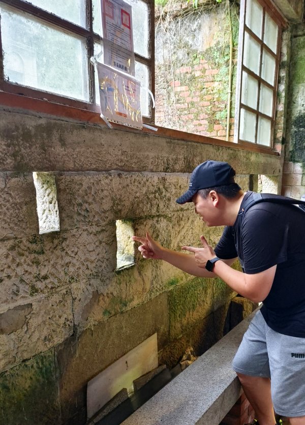 ▼前廊的牆壁上還留有兩個長方形小孔,是戰時為了偵防之用,雖然大家開玩笑說這個可以當作狙擊孔使用,但還是不難感受到當時的緊張氣氛。